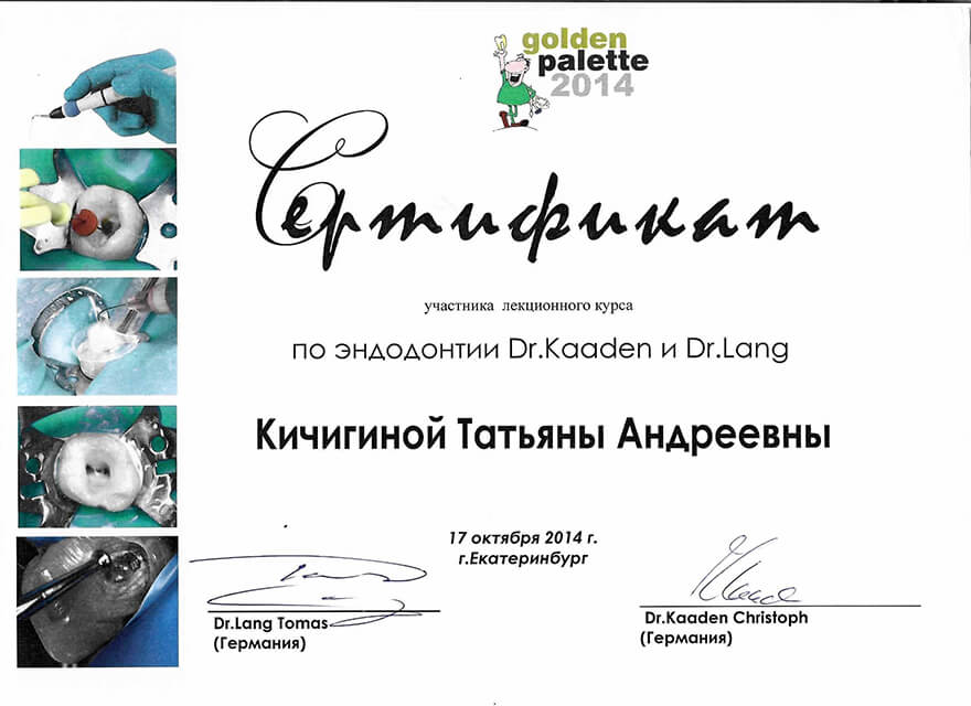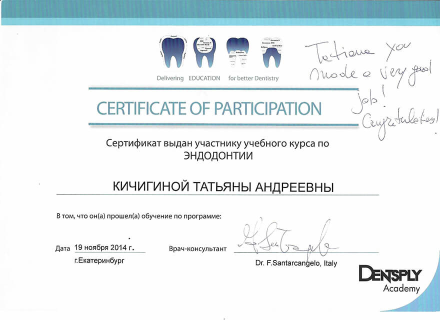 2014 г. – Учебный курс по эндодонтии. Лектор- Dr. F. Santarcangelo, Dentsply Academy