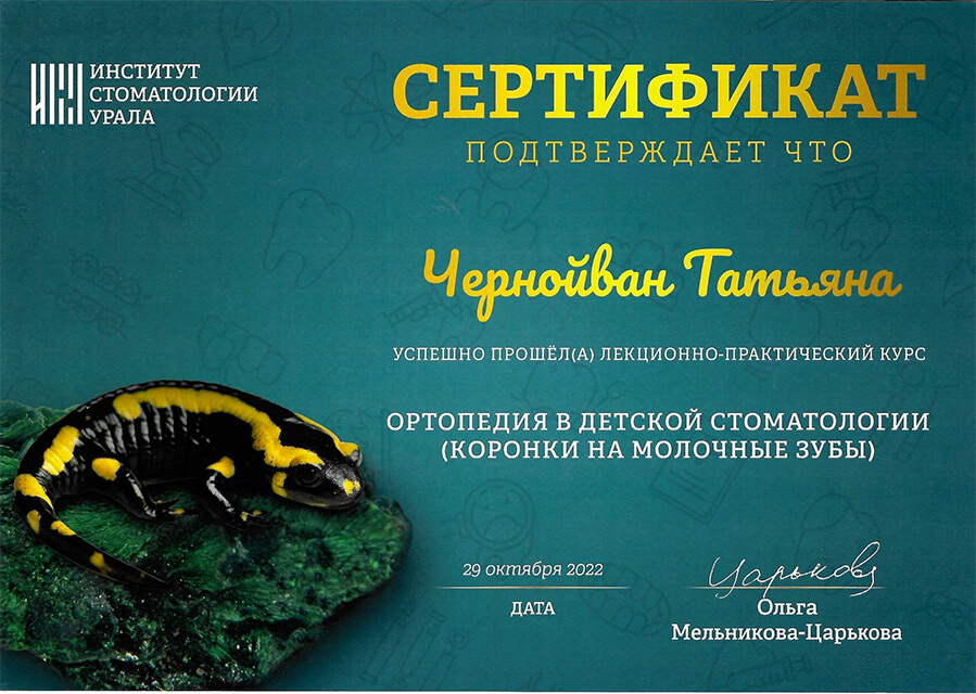 2022 г. – «Ортопедия в детской стоматологии (коронки на молочные зубы)» (Институт Стоматологии Урала). Лектор- Ольга Мельникова- Царькова.