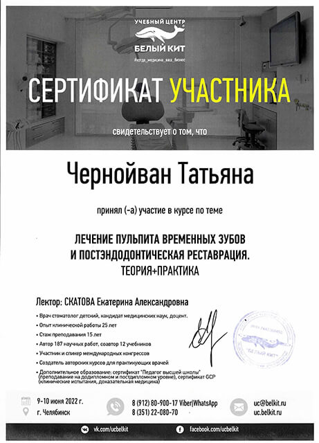 2022 г. – «Лечение пульпита временных зубов и постэндодонтическая реставрация» (УЦ «Белый Кит»). Лектор- Скатова Екатерина Александровна.