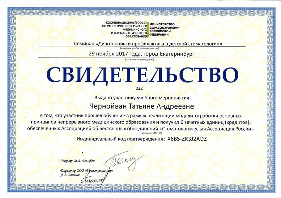 2017 г. – «Диагностика и профилактика в детской стоматологии» (ООО «Уралэкспоцентр»). Лектор- Бельфер М. Л.