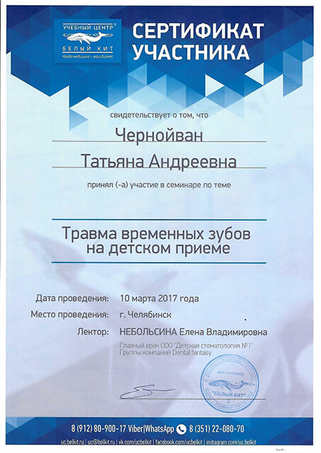 2017 г. – «Травма временных зубов на детском приёме» (УЦ «Белый Кит»). Лектор-Небольсина Е.В.