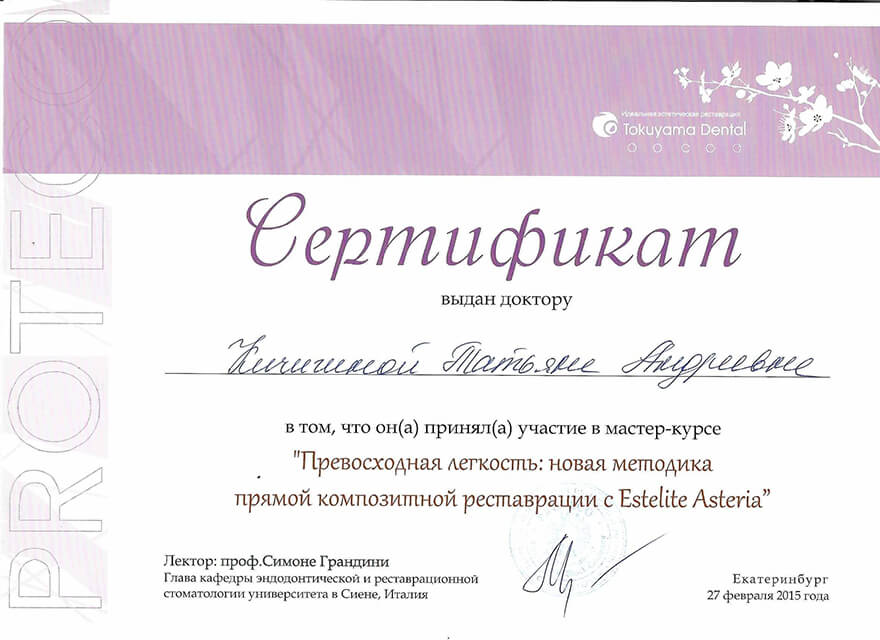 2015 г. – «Превосходная лёгкость: новая методика композитной реставрации с Estelite Asteria». Лектор- профессор Симоне Грандини, глава кафедры эндодонтической и реставрационной стоматологии университета в Сиене, Италия.