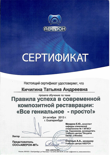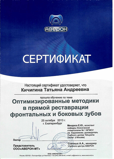 2013 г. – «Оптимизированные методики в прямой реставрации фронтальных и боковых зубов» (ООО «Аверон-МТ»). Лектор- Мендоса Е. Ю.