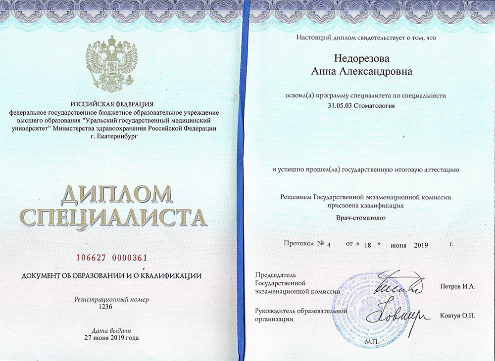 Недорезова Анна Александровна — детский стоматолог-терапевт со стажем более 7 лет. Она борется с кариесом и восстанавливает зубки после травм. Бережно относится к каждому зубу пациента и всегда старается спасти зубы от удаления. Анна Александровна рассмешит перед лечением и избавит от тревог даже самого напуганного малыша.