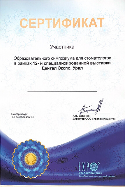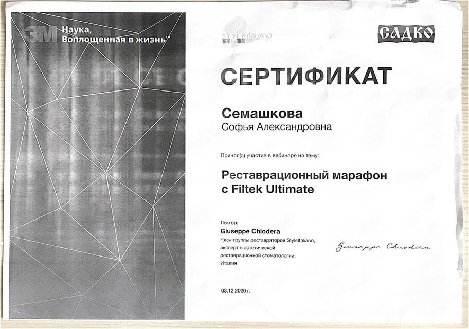 2020 г. — обучение на курсе «Реставрационный марафон с Filtek Ultimate», Екатеринбург.