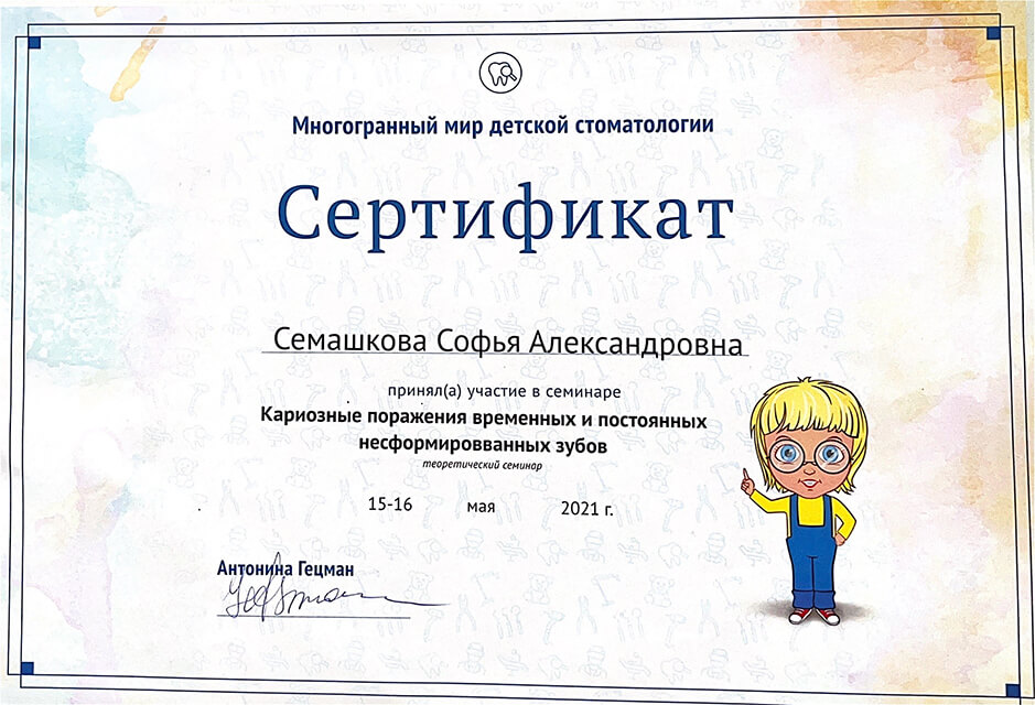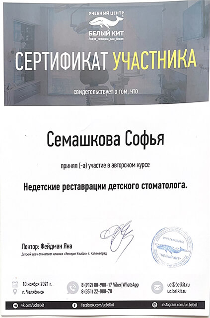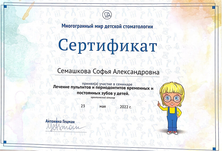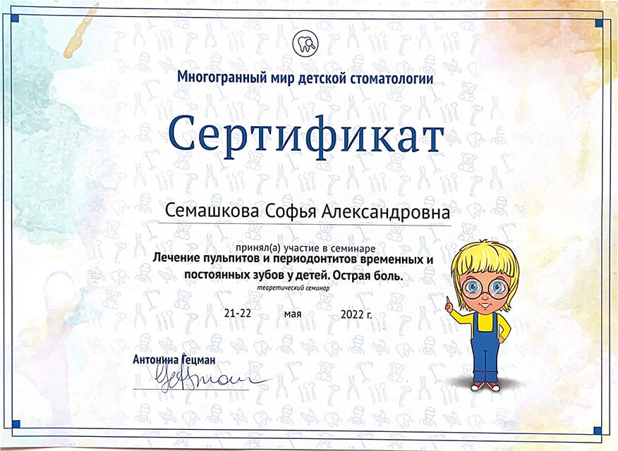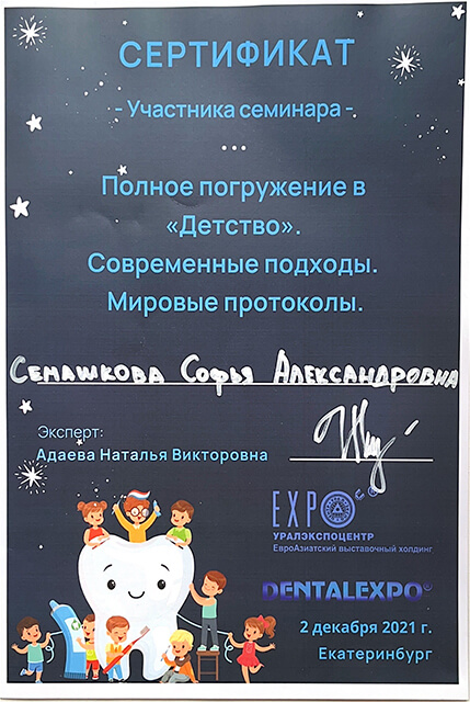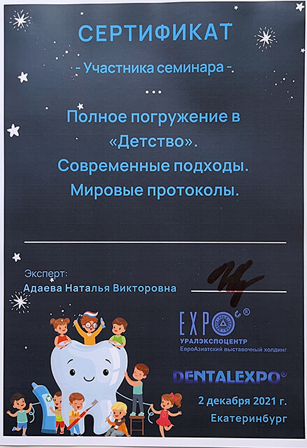 2022 г. — обучение на курсе «Лечение пульпитов и периодонтитов временных и постоянных зубов у детей. Острая боль», Екатеринбург.