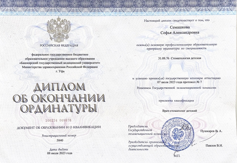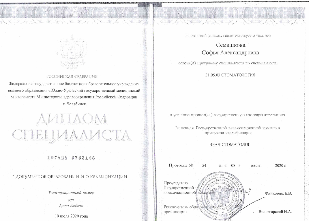 Софья Александровна окончила Южно-уральский государственный медицинский университет по специальности «Стоматология» в 2018 г.