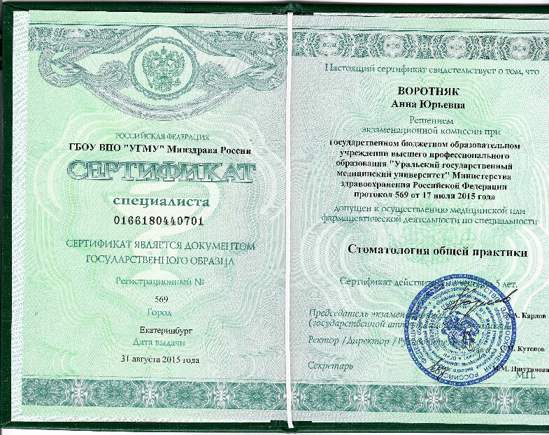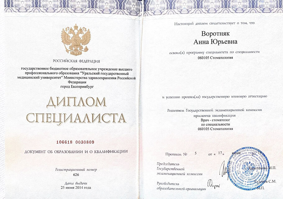 2009- 2014 гг. «Уральский государственный медицинский университет» Министерства здравоохранения Российской Федерации по специальности «Стоматология».