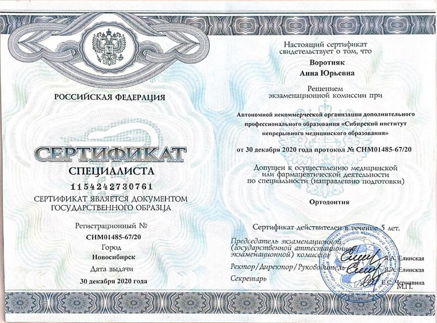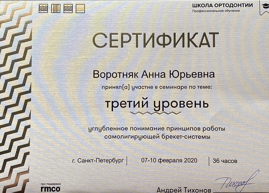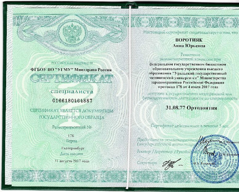 2015- 2017 гг. «Уральский государственный медицинский университет» Министерства здравоохранения РФ», ординатура по специальности «Ортодонтия».