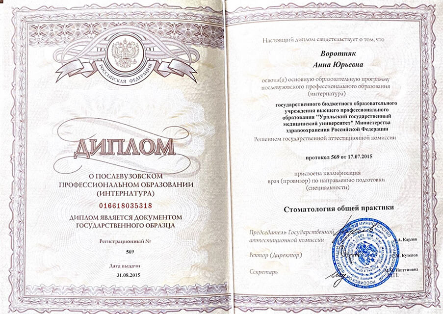 2014- 2015 гг. «Уральский государственный медицинский университет» Министерства здравоохранения РФ., интернатура по специальности «Стоматология общей практики».