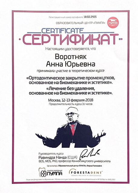 2018 г.- «Ортодонтическое закрытие промежутков, основанное на биомеханике и эстетики»